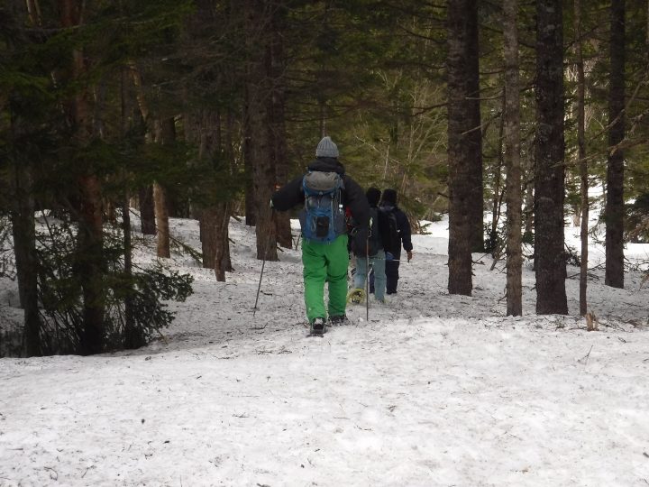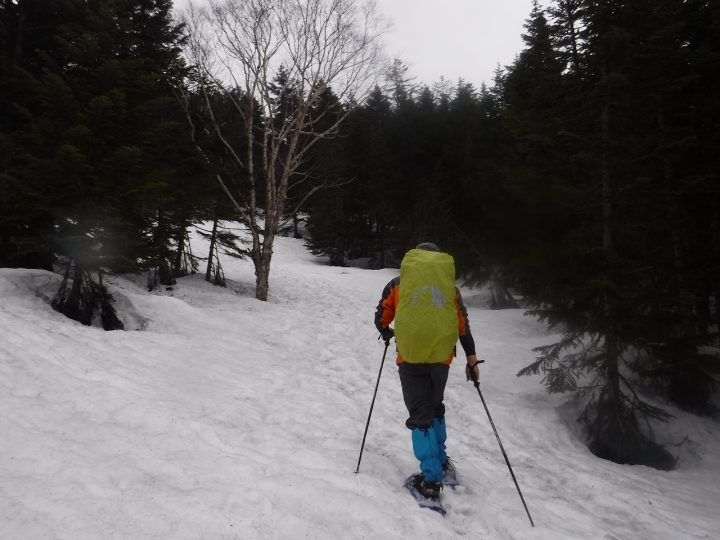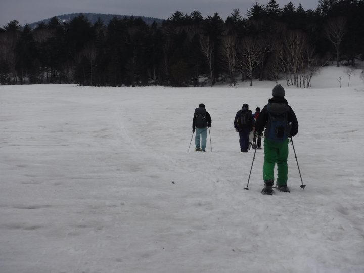 スノーシュー&ストック装備で山を越えて行くことになります。