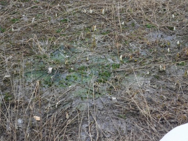 雪原に一部雪解け箇所があり、そこには小さな水芭蕉が芽を出していました。