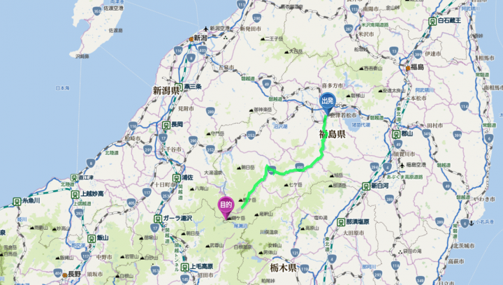 会津若松(標高218m)~下郷町~田島町~南郷~伊南~檜枝岐村~御池口(標高1,520m)