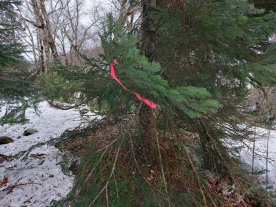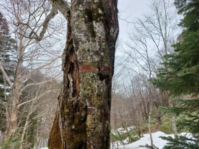 森の中は雪で道がわからなくなるので、枝にピンクのリボンや、木の幹に赤のスプレーでマークされてます。